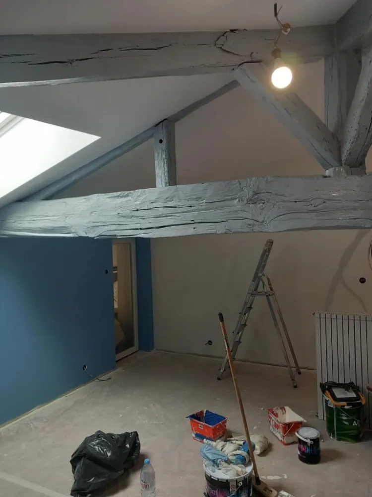 Votre entreprise de peinture à Mogneneins est intervenue pour un ponçage des poutres de la charpente apparente, l'application d'une sous-couche de protection ainsi qu'une finition en peinture dans le cadre d'une rénovation de chambre.